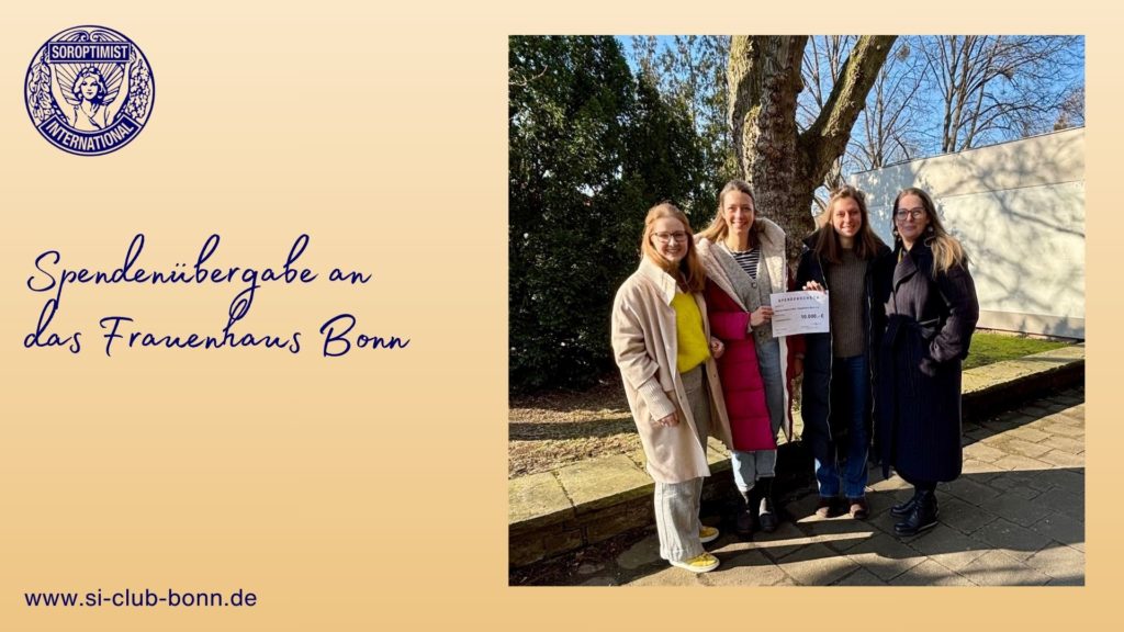 Mit großer Freude und Dank nahmen die Vertreterinnen des „Hilfe für Frauen in Not – Frauenhaus Bonn e.V.“ im Februar 2025 die diesjährige Spende des SI-Clubs Bonn entegegen. 10.000 Euro! Der komplette Erlös des Adventskalenders 2024 konnte überreicht werden. Das Frauenhaus bietet Frauen und Kindern Schutz, Beratung und Unterstützung beim Neuanfang.